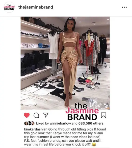 Kim Kardashian West sounded off on fashion brands who allegedly jocked her steeze. The mother of (almost) four posted a photo posing in a golden metallic dress designed by husband Kanye West. Kim wrote in the caption Friday morning,