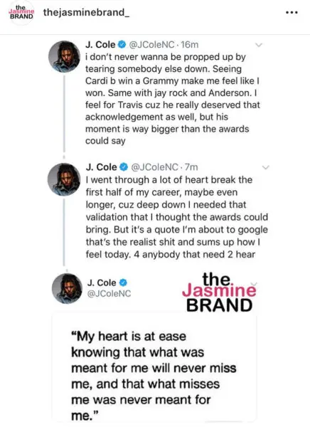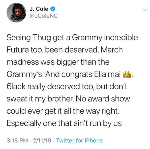 Cole took to Twitter to congratulate the winner’s of Sunday’s Grammy Awards while also giving recognition to artist like Young Thug and 6lack.