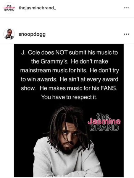 J Cole does NOT submit music to the Grammy’s. He don’t make mainstream music for hits. He don’t try to win awards. He ain’t at every award show. He makes music for his FANS. You have to respect it.