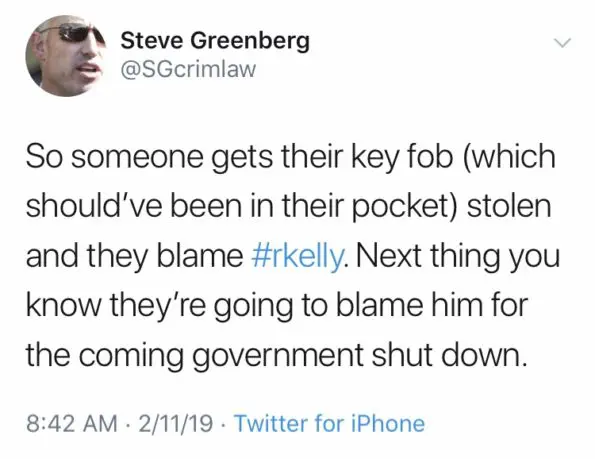 “So someone gets their key fob (which should’ve been in their pocket) stolen and they blame #rkelly. Next thing you know they’re going to blame him for the coming government shut down.”