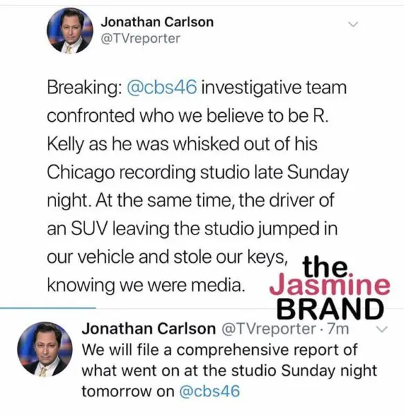 “Breaking: @cbs46 investigative team confronted who we believe to be R. Kelly as he was whisked out of his Chicago recording studio late Sunday night. At the same time, the driver of an SUV leaving the studio jumped in our vehicle and stole our keys, knowing we were media.”