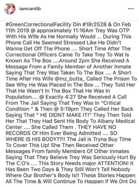 Cardi B helped shine light on a missing body at a prison in New York. The rapper took to Instagram to repost a lengthy caption from another user explaining the story about former inmate Anthony Myrie being allegedly murdered by a correctional officer at the Greene Correctional Facility: