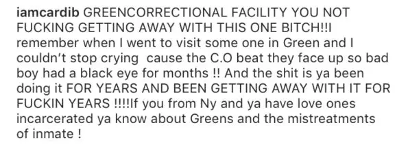 Cardi reposted a screenshot of the caption and added about her own experience of dealing with a sour correctional officer.