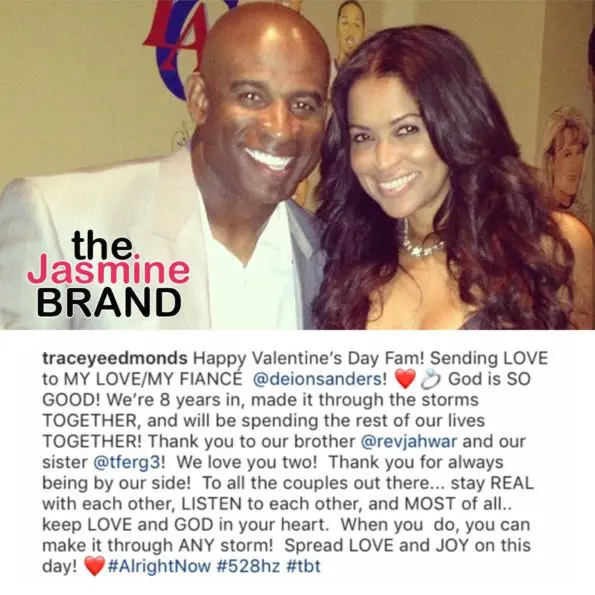 With Valentine’s Day here, love is definitely on the horizon for Deion Sanders and his longtime girlfriend Tracey Edmonds. The pair, who’ve been together for 8 years, are now fiancés. Edmonds made the news very clear in a post on Instagram Thursday. In a throwback image of the couple, Edmonds’ revealing caption read: