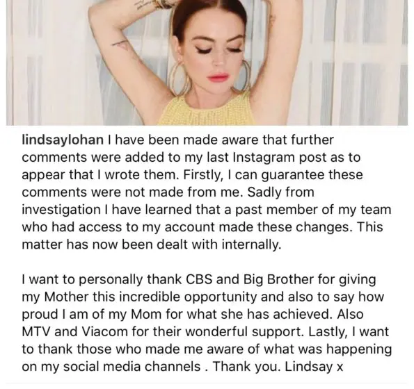 “I want to personally thank CBS and Big Brother for giving my Mother this incredible opportunity and also to say how proud I am of my Mom for what she has achieved. Also MTV and Viacom for their wonderful support. Lastly, I want to thank those who made me aware of what was happening on my social media channels . Thank you. Lindsay”