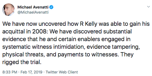 Avenatti tweeted Sunday evening allegations surrounding Kelly’s 2008 child pornography acquittal trial. Accusing Kelly and his counsel of tampering with trial: