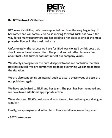 Following BET taking down the tweet, Minaj became aware of the embarrassing moment, sparking her label, Young Money to withdraw all talent from their upcoming BET Experience and BET Award show this summer. Minaj announced,