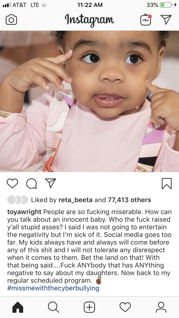 T.I. & Tiny: The Family Hustle star Toya Wright is riding high after recently celebrating her daughter Reign Beaux’s first birthday, but social media commenters are relentless on their quest to try and dim her happiness. In response to cruel comments left on social media about her young daughter’s appearance and the appearance of her oldest daughter Reginae, Wright posted dual messages on her Instagram account to shut down all haters and trolls alike with a warning.