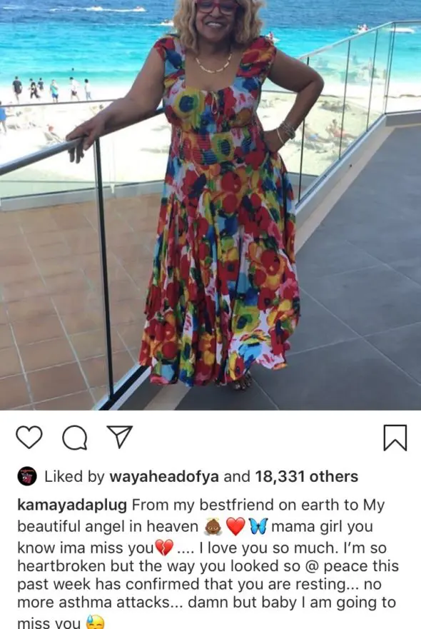 “From my bestfriend on earth to My beautiful angel in heaven ?????mama girl you know ima miss you?…. I love you so much. I’m so heartbroken but the way you looked so @ peace this past week has confirmed that you are resting… no more asthma attacks… damn but baby I am going to miss you ?”