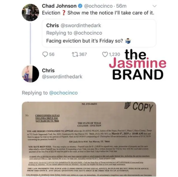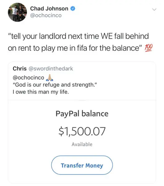 Former NFL player, Chad Johnson took to social media to interact with a few followers on Friday. The 6-time NFL Pro Bowler, asked how everyone’s Friday was going. In response to Johnson’s question, a fan responsed to Johnson mentioning he was at risk of being evicted from his home.