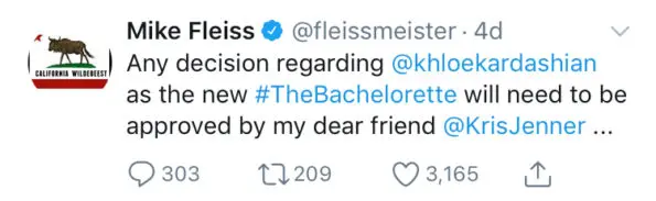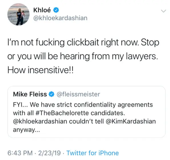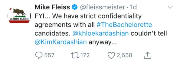 How would @KimKardashian know??? This is between me and @KrisJenner — and most importantly @khloekardashian !!!FYI… We have strict confidentiality agreements with all #TheBachelorette candidates. @khloekardashian couldn’t tell @KimKardashian anyway…