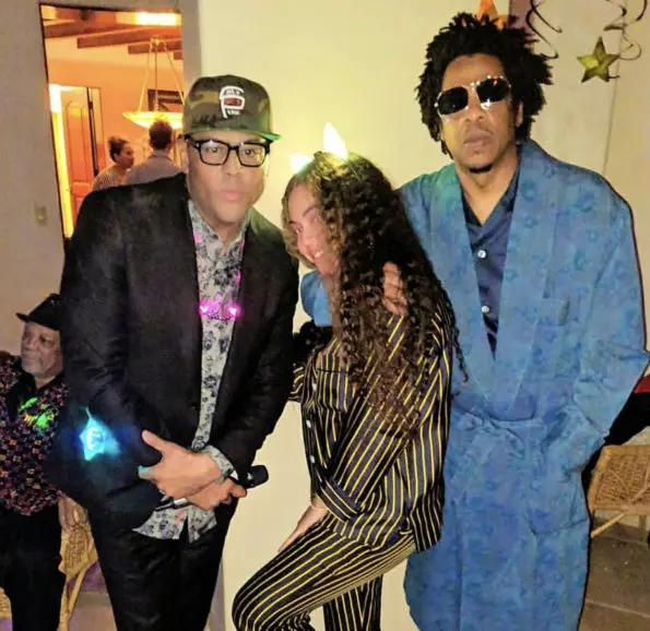 The couple took a quick snap-shot with singer, Al B. Sure during the 90’s party. In the photo, Beyonce lets her hair down as she gives a smile with little to no make-up and sports some cute kitten ears, wearing black and yellow stripped pajamas. Jay wears a printed blue robe. Although, Al B may have missed the memo about wearing pajamas to the event, he held a microphone, crossing his arms while posing with Bey and Jay. At the bottom left of the photo, you can spot Mr. Quincy Jones relaxed in a chair enjoying the festivities.