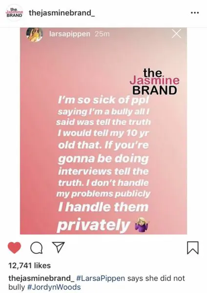 Since then, social media users have accused Larsa Pippen, 44, of bullying Jordyn Woods, 21. She addressed this accusation with an Instagram Story post. She said: