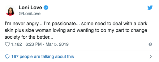 “I’m never angry… I’m passionate… some need to deal with a dark skin plus size woman loving and wanting to do my part to change society for the better…,” Loni tweeted just hours after the episode aired Tuesday.