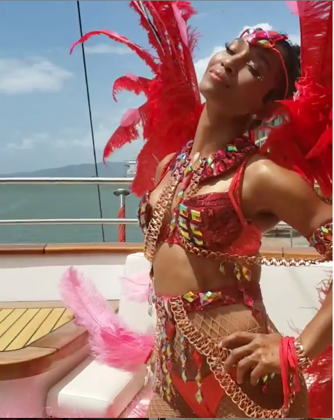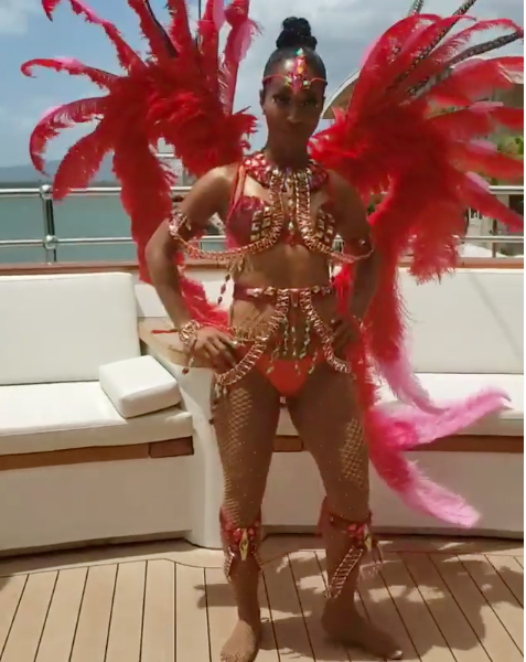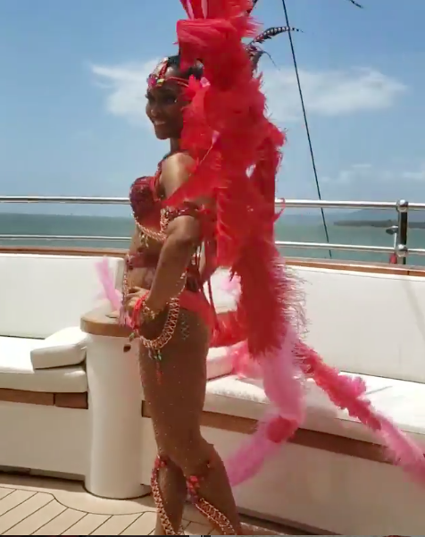 Lil Kim and Mya also wear super haute Trinidad costumes. The pair were spotted on a float, enjoying the Trinidadian music.