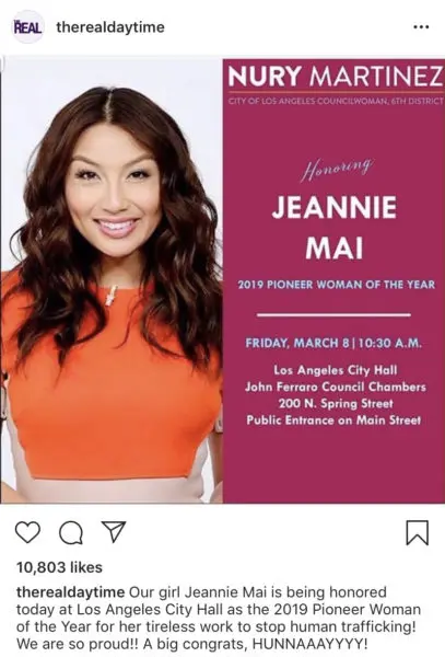 “Our girl Jeannie Mai is being honored today at Los Angeles City Hall as the 2019 Pioneer Woman of the Year for her tireless work to stop human trafficking! We are so proud!! A big congrats, HUNNAAAYYYY!”