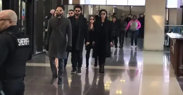 Smollett, dressed in a gray trench coat with accompanying gloves and aviator shades, had plenty of support with him as he walked into the courtroom. Several of his siblings can be seen walking with him as cameras flashed rapidly attempting to capture his every move.