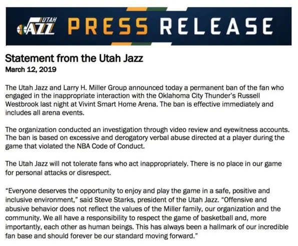 As an result of the altercation, the Utah Jazz announce on Tuesday afternoon, the team has permanently banned the fan, Shane Keisel, from attending any and all games at the Vivint Smart Home Arena. In a press release, Jazz President, Steve Starks comments on the inappropriate verbal altercation.