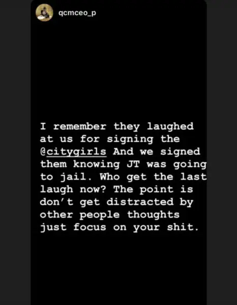 “I remember they laughed at us signing the City Girls and we signed them knowing JT was going to jail. Who get the last laugh now? The point is don’t get distracted by other people thoughts just focus on your sh*t.”