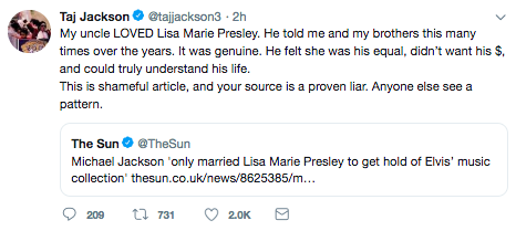 Taj’s tweet was in response to an article in The Sun , where Michael’s maid, Adrian McManus, said Michael had ulterior motives when he married Pressley.