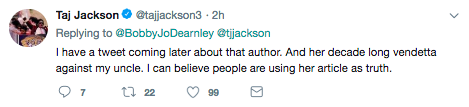“I have a tweet coming later about that author. And her decade long vendetta against my uncle. I [can’t] believe people are using her article as truth.”
