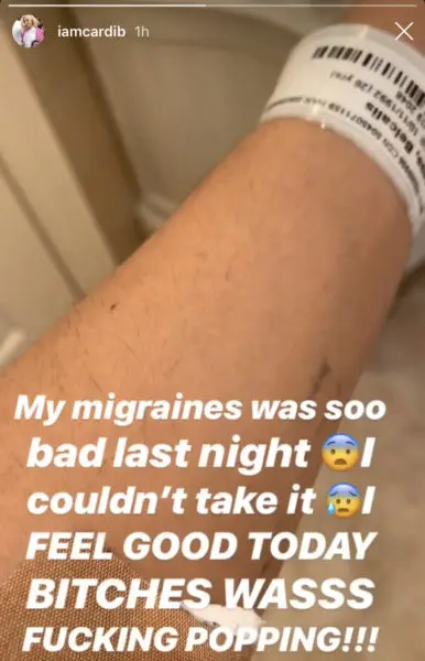 It looks like Cardi B is in full recovery mode! The rapper posted a photo wearing s hospital bracelet, letting fans know she suffered migraines.