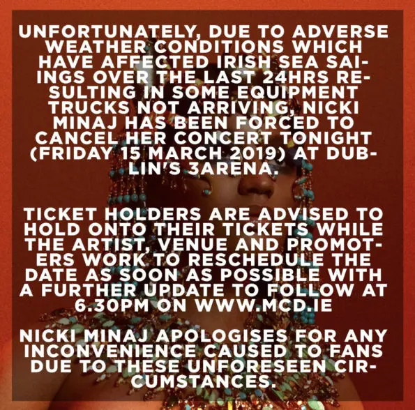 “Due to adverse weather conditions which have affected Irish Sea sailings over the last 24 hours resulting in some equipment trucks not arriving, Nicki Minaj has been forced to cancel her concert tonight at Dublin’s 3Arena.”