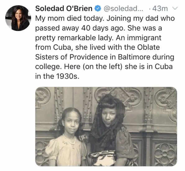 Beloved former CNN anchor/broadcast journalist Soledad O’Brien is going through a tough time. She recently shared news of her mother Estella O’Brien‘s passing with her Twitter followers. Her mother shockingly passed just over a month and a half after her father’s passing. Soledad shared a beautifully informative thread on her mother’s life story as a Afro-Cuban immigrant.