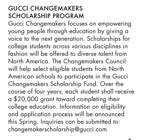 In addition, Gucci launched a scholarship that will give a $20,000 grant over the course of four years to selected students. The purpose of the program is to help diversify the pool of individuals who pursue careers in the fashion industry.
