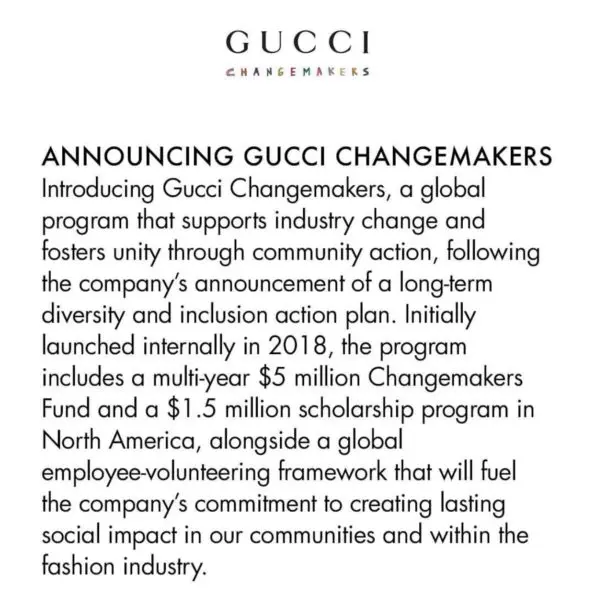 “What we are announcing tomorrow is game-changing for the industry at large. After meeting with some of he industry’s leading black minds and other in fashion, business, and culture, we’ve helped Gucci come up with programs that will positively impact the Black community and fashion as whole.”