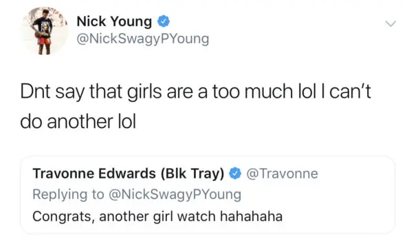 As far as the gender of their child, looks like Young is shooting for another baby boy. In a tweet, Young says girls are too much work.