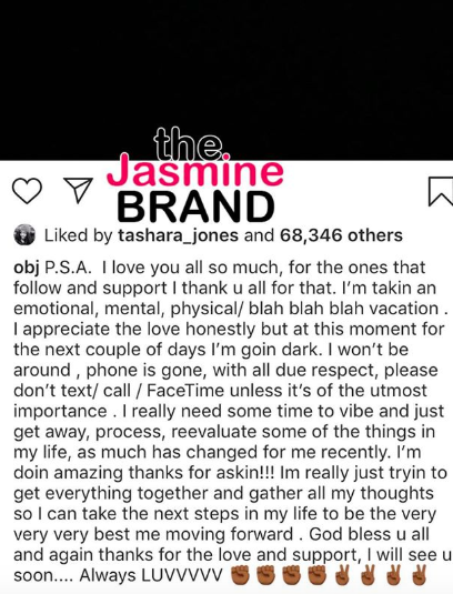 “I love you all so much, for the ones that follow and support thank u all for that. I’m takin an emotional, mental physical/blah blah blah vacation. I appreciate the love honestly but at this moment for the next couple days I’m goin dark. I won’t be around, phone is gone, with all due respect, please don’t text/call/FaceTime unless it’s of the utmost importance.