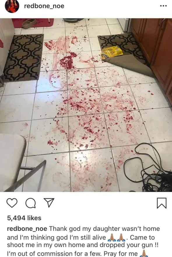“Thank god my daughter wasn’t home and I’m thinking god I’m still alive ????. Came to shoot me in my own home and dropped your gun !! I’m out of commission for a few. Pray for me ??”
