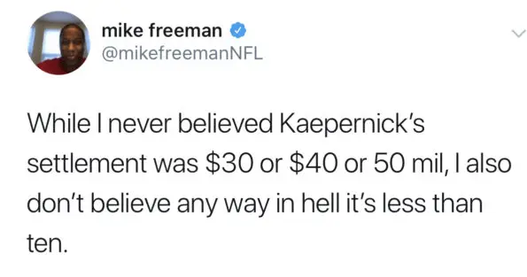 “While I never believed Kaepernick’s settlement was $30 or $40 or 50 Mil, I also don’t believe any way in hell it’s less than ten.”