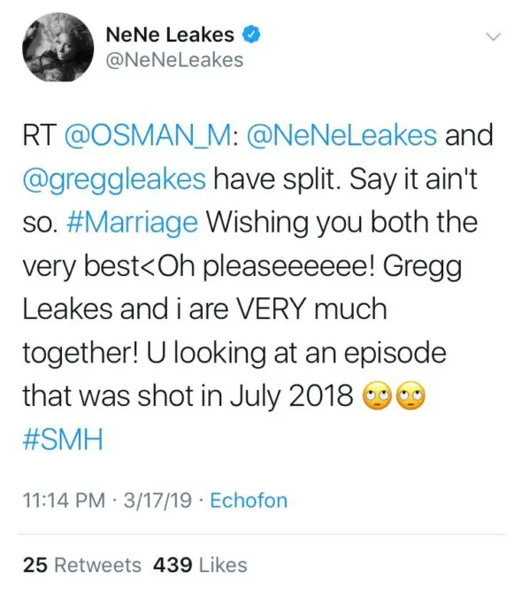 Earlier this week, NeNe addressed the rumors that she and Gregg were separated and heading for divorce. In a tweet on social media, she explained that the current episodes of RHOA were shot back in July 2018 and that she and Gregg are in a much better place these days—and are not separated or divorcing.