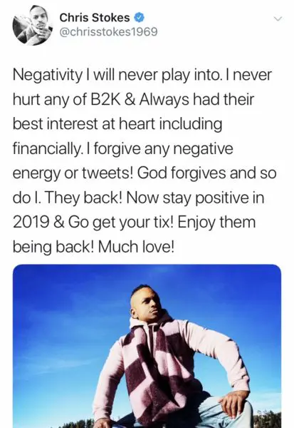 “Negativity I will never play into. I never hurt anybody in B2K & Always had their best interest at heart including financially. I forgive any negative energy or tweets! God forgives and so do I. They back! Now stay positive in 2019 & Go get your tix! Enjoy them being back! Much love!”