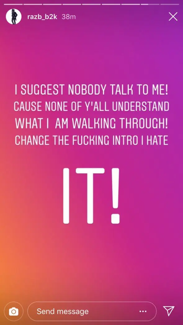 “I suggest nobody talk to me! Cause none of ya’ll understand what I am walking through! Change the f**cking intro I hate IT!”