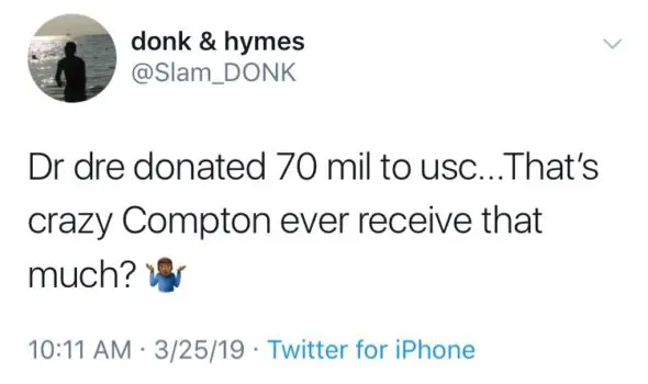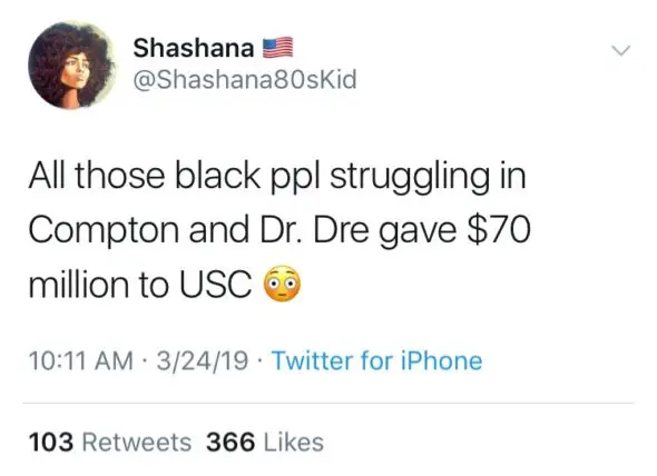 For those who don’t know, back in 2013 Dr. Dre donated a whopping $70 million dollars to USC…and even has a building (Andre Young Academy of Arts and Technology) at the university named after him. When social media discovered this tidbit of information, they quickly called Dre out, reminding him that donating such an enormous amount of money is not exactly getting in