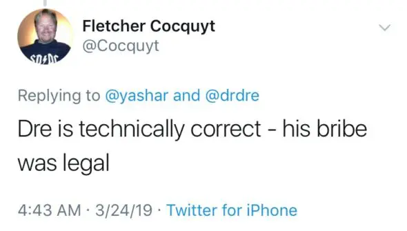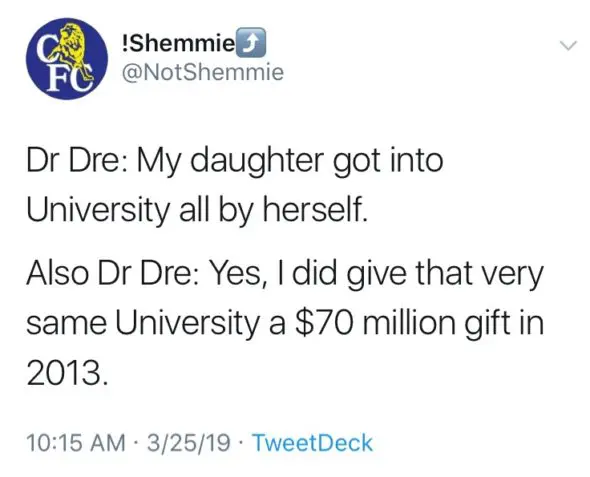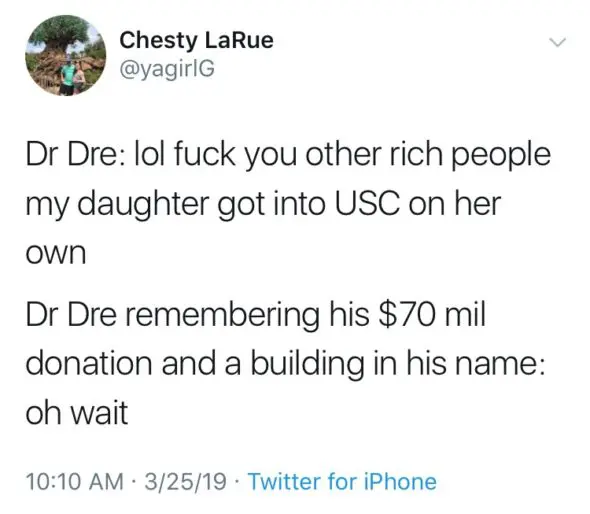 The backlash was so harsh and immediate, that both Dre and his daughter deleted their initial posts. Critics were quick to point out, that while he may not have done anything illegal to ensure his daughter’s acceptance to USC, donating almost $100 million dollars to the university is far from getting accepted on your own merit.