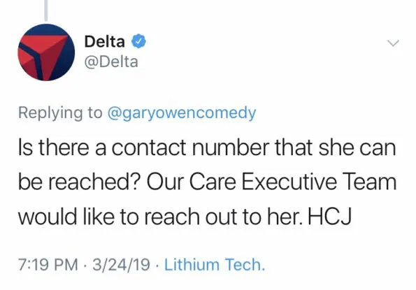 Delta Airlines issued a standard customer service reply to Gary Owens on Twitter, requesting his contact information. Delta tweeted: