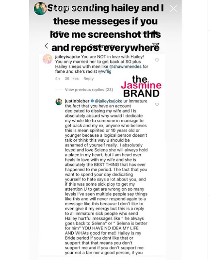 I’ve seen multiple people say things like this and will never respond again to a message like this because I don’t like to even give it my energy but this is a reply to all immature sick people who send Hailey hurtful messages like ‘he always goes back to Selena’ or ‘Selena is better for him.’ YOU HAVE NO IDEA MY LIFE AND WHAT’S good for me!! Hailey is my Bride period if you don’t like that or support that that means you don’t support me and if you don’t support me you’re not a fan or a good person.”