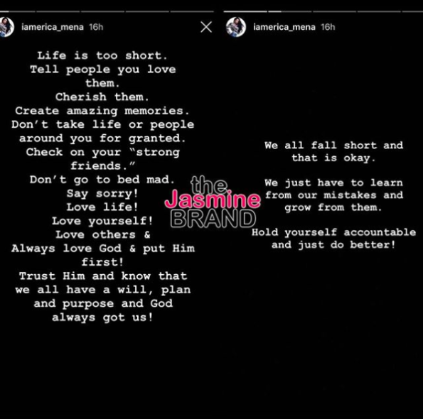 “Life is too short. Tell people you love them. Cherish them. Create amazing memories. Don’t take life or people around you for granted. Check on your ‘strong friends.’ Don’t go to bed mad. Say sorry! Love life! Love yourself! Love others & Always love God & put Him first! Trust Him and know that we all have a will, plan and purpose and God always got us!”