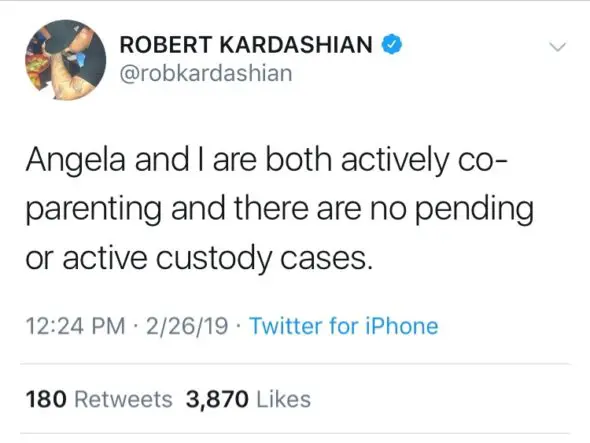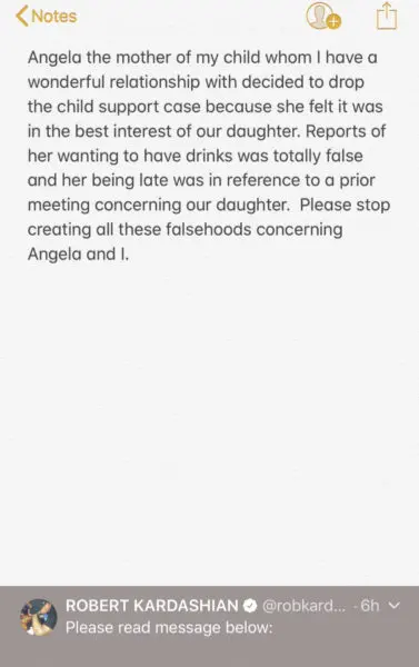“Angela the mother of my child whom I have a wonderful relationship with decided to drop the child support case in the best interest of our daughter. Reports of her wanting to have drinks was totally false and her being late was in reference to a prior meeting concerning our daughter. Please stop creating all these falsehoods concerning Angela and I.”