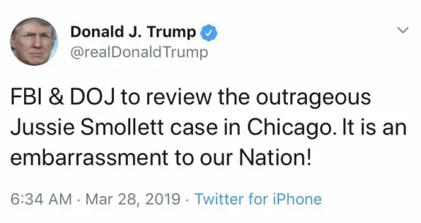 “FBI & DOJ to review the outrageous Jussie Smollett case in Chicago. It is an embarrassment to our Nation!”