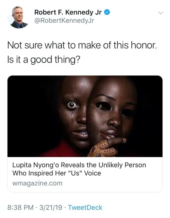 Robert F. Kennedy Jr., an environmental attorney, author, activist and nephew of President John F. Kennedy, suffers from a condition known as spasmodic dysphonia, which is a vocal disorder that makes one’s speech scratchy and their voice quiver. Nyong’o has repeatedly admitted that the condition, and specifically Kennedy Jr., was the inspiration for the voice she used for one of her characters in Us, named Red.