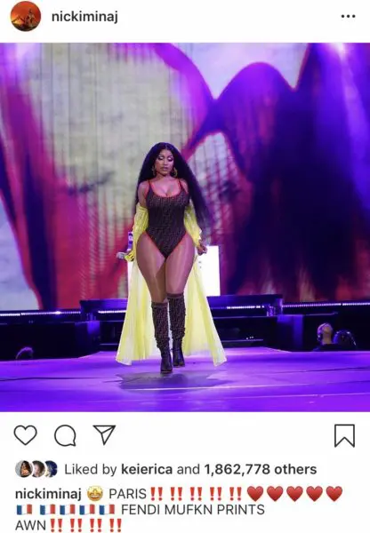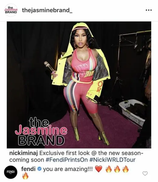 This must mean Nicki Minaj and Fendi are a combination that we won’t be going away anytime soon. Fendi has been a major part of her “Nicki WRLD Tour” wardobe.