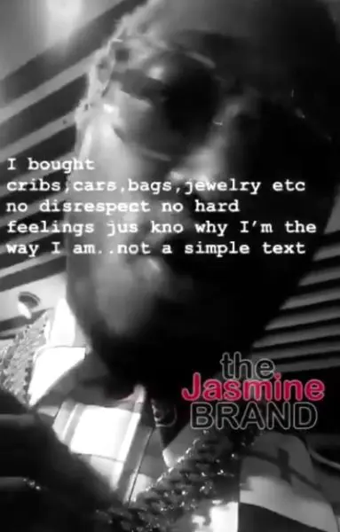 “I bought cribs, cars, bags, jewelry etc no disrespect no hard feelings jus kno why I’m the way I am..not a simple text”
