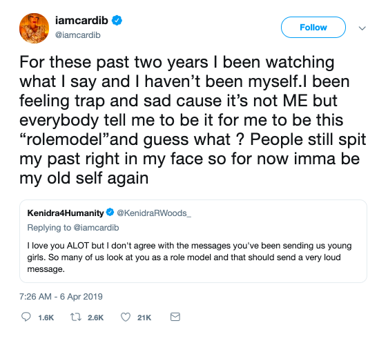 Cardi certainly didn’t offer a traditional response. Instead, she admitted that she’s been feeling stuck when it comes to being a role model and that she’s going to divert to her old ways.