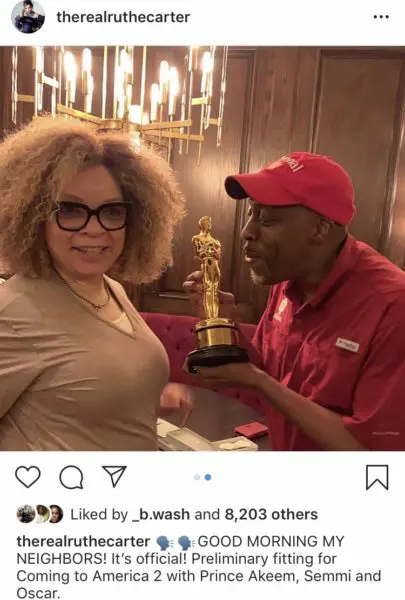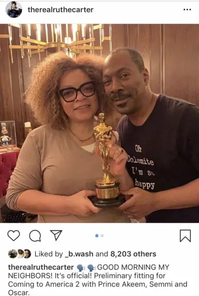 The kingdoms of Zamunda and Wakanda are officially uniting! Academy Award-winning “Black Panther” costume designer, Ruth E. Carter, confirmed on social media that production for Eddie Murphy and Arsenio Hall‘s “Coming to America” sequel has started! She posted photos posing with both Eddie and Arsenio while holding her coveted Oscar award with the following caption: