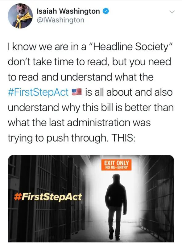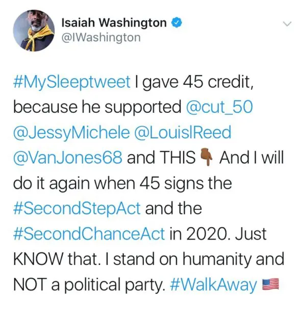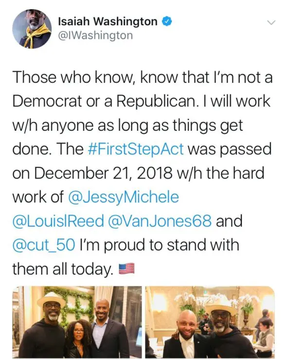 “Those who know, know that I’m not a Democrat or a Republican. I will work w/h anyone as long as things get done. The #FirstStepAct was passed on December 21, 2018 w/h the hard work of @JessyMichele @LouislReed @VanJones68 and @cut_50 I’m proud to stand with them all today.”